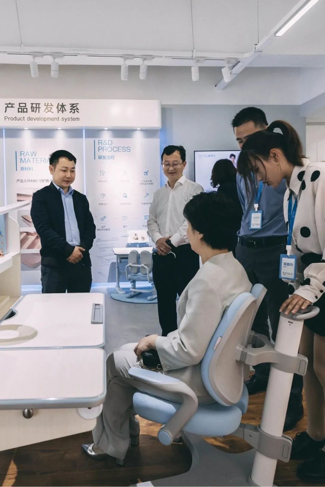 在工作人员的调试下,季晶区长亲自坐上学习椅体验,并与随行人员分享感受。对爱果乐儿童学习桌椅的美感、功能、舒适度以及人体工程学设计给予了高度评价。季晶区长说道:“能够帮助孩子养成良好坐姿习惯的儿童桌椅,值得每一个家庭拥有,应该得到广泛关注。相比于国外上万的高额售价,爱果乐的性价比是爱果乐社会责任的一种体现。”